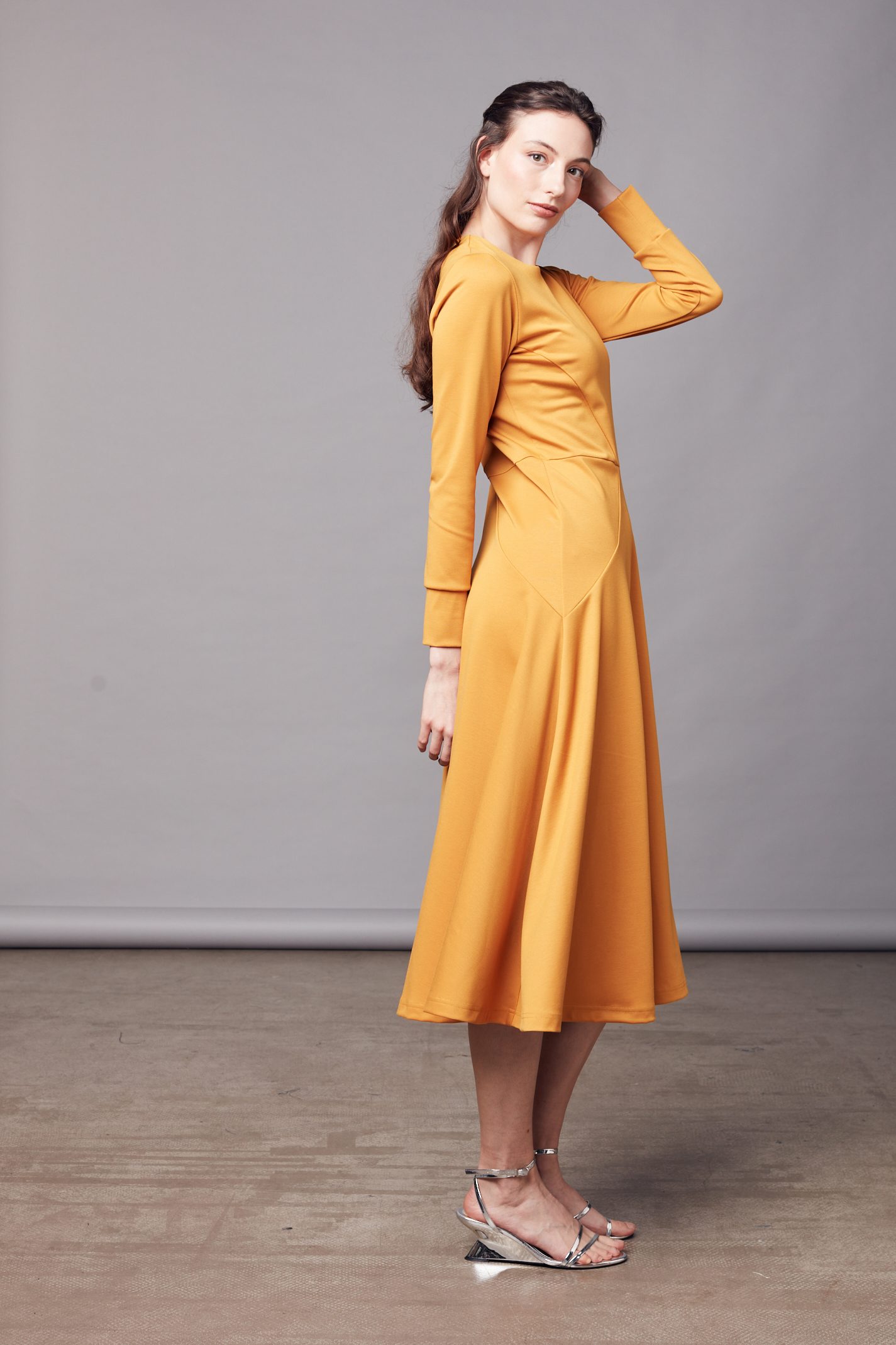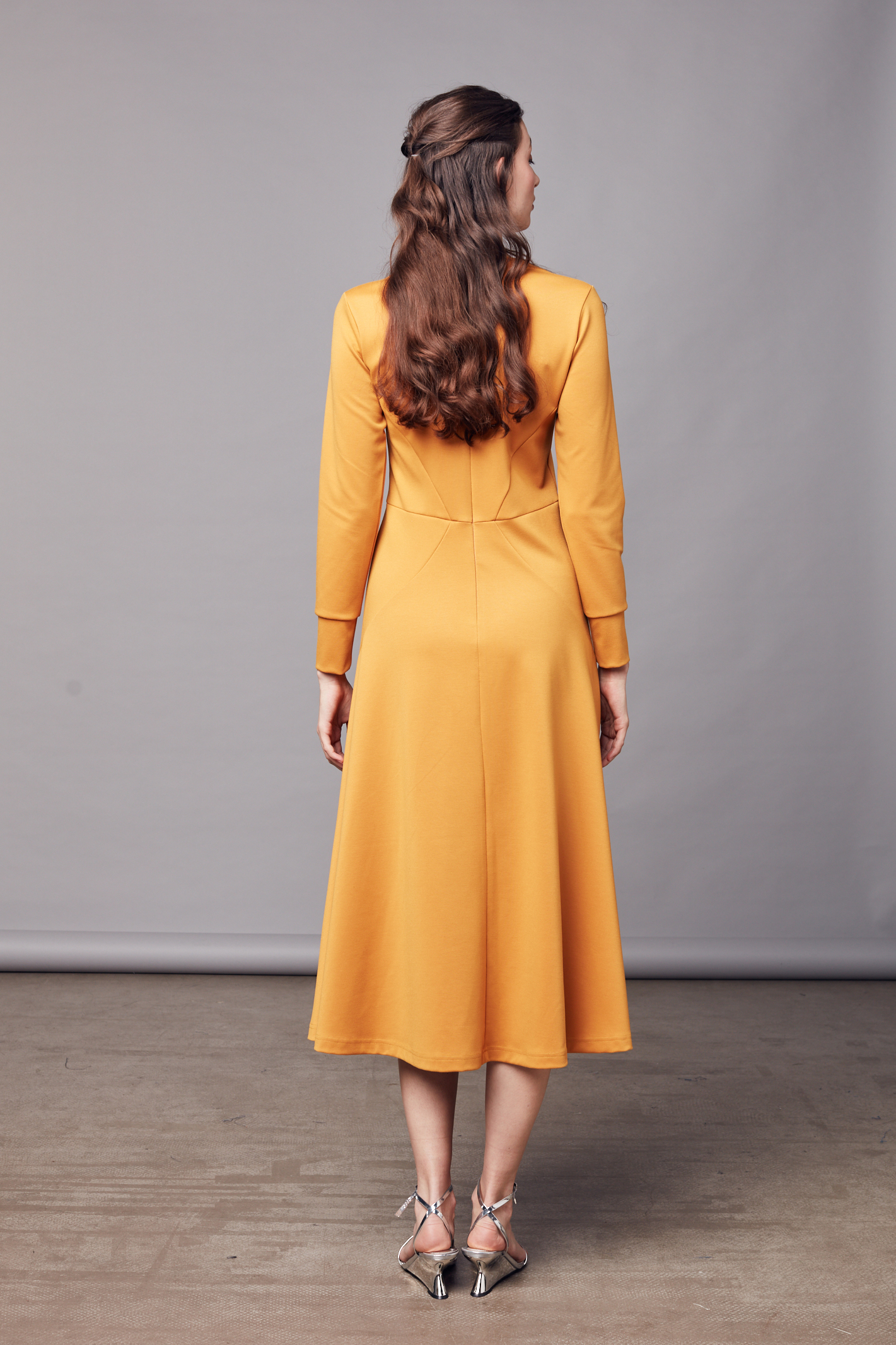 Podzimní šaty Eva z kvalitního silnějšího úpletu v elegantní medově žluté barvě mají štíhlou siluetu.
