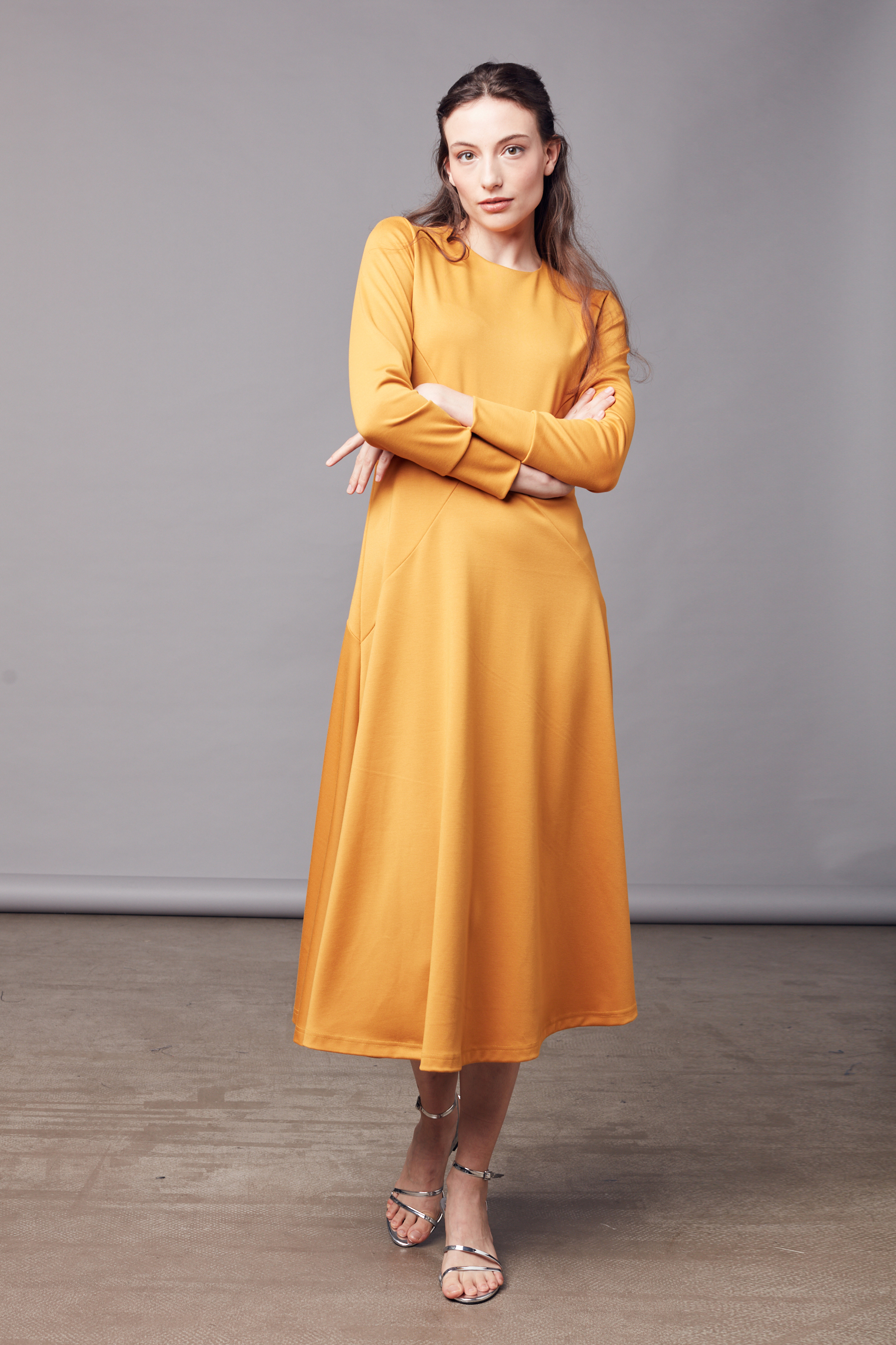 Šaty střihem vytvářejí symetrickou siluetu s kolovou sukní, která krásně padne a zdůrazní ženský tvar. Vsadky na bocích tvarují postavu a zajišťují pohodlí. Dlouhé rukávy bez výstřihu podtrhují nadčasovou eleganci tohoto modelu.